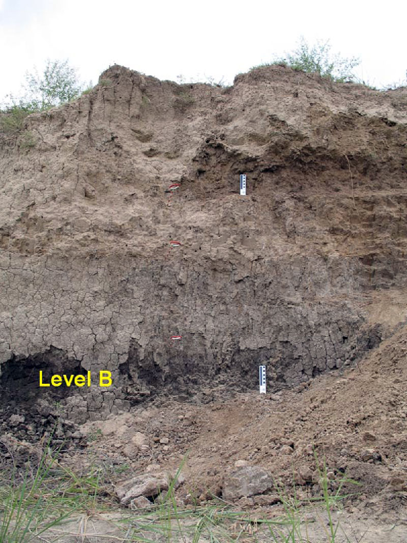 FIGURE 1. Upper part of outcrop along Sand Creek, Meade Co., Kansas, showing the zone (Level B) from which the Golliher B rodents were excavated. Vertical black line on rulers equals 10 cm.