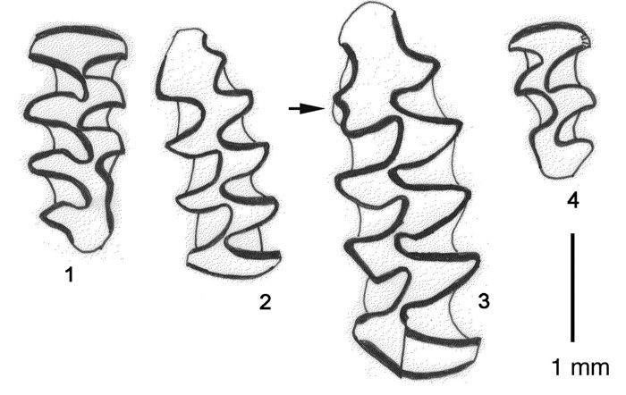 FIGURE 2. First lower and upper third molars of Microtus pennsylvanicus (2.1, FHSM 17019 Lm1; 2.2, FHSM 17031 LM3) and Microtus (Pedomys) parmaleei (2.3, FHSM 17023 holotype Lm1; 2.4, FHSM 17026 paratype RM3). Note cement-filled prism fold (arrow) in 2.3; this valley is filled with cement to the base of the tooth.