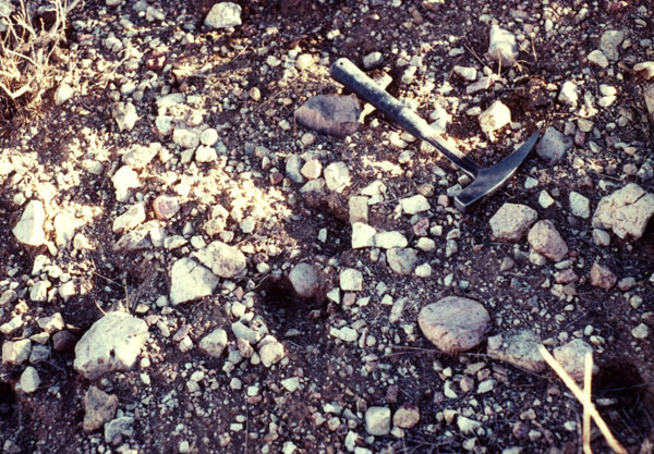FIGURE 19. Poorly sorted, sandy conglomerate within Member Five. Pebble to small boulder size clasts are dominated by subrounded to angular Bobtail Quartz Latite lithologies. Rock hammer for scale.