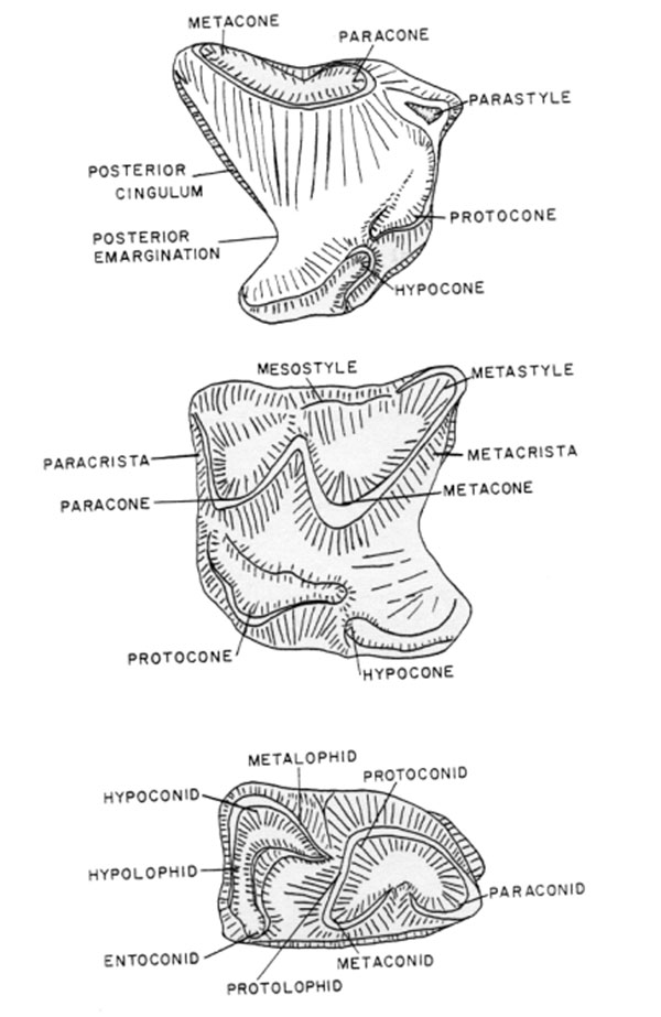 FIGURE 26. Dental terminology used in the description of Cryptotis n. sp. Line drawings are of Cryptotis n.sp.
