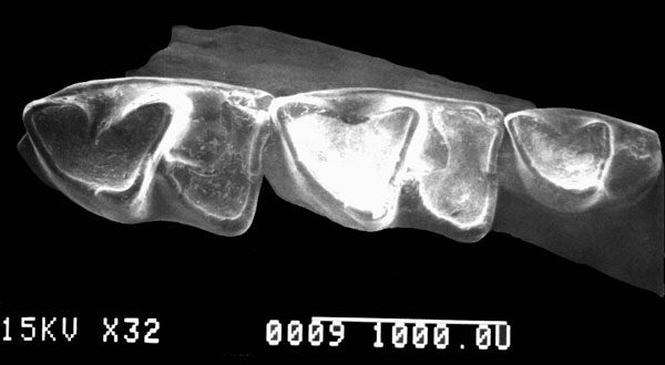 FIGURE 28. Cryptotis n. sp. (UCMP 317826): occlusal view of tooth row M1 - M3 from left to right. SEM image. Scale equals 1 mm.