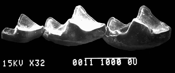 FIGURE 29. Cryptotis n. sp. (UCMP 317826): lingual view of tooth row M1 - M3 from right to left. SEM image. Scale equals 1 mm.