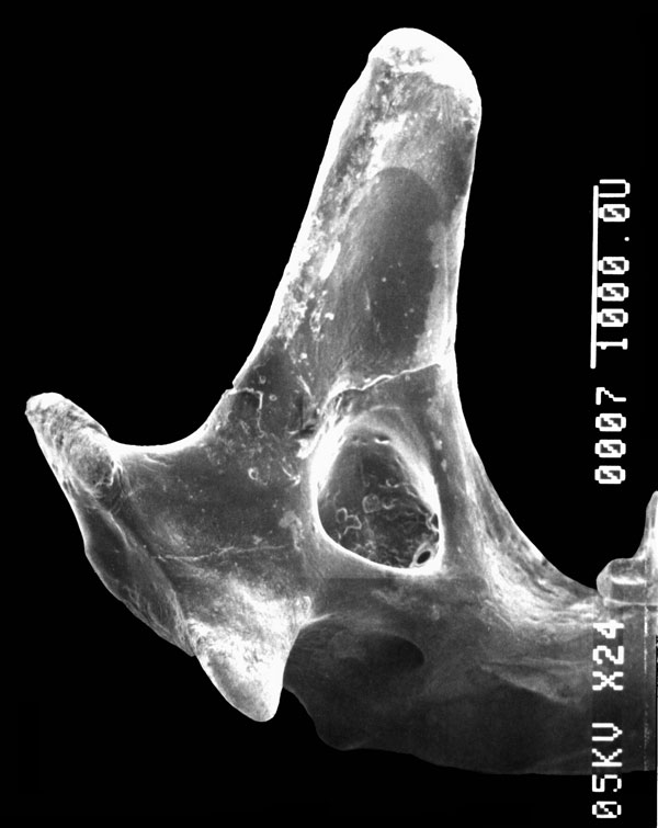 FIGURE 32. Cryptotis n. sp. (UCMP 317826): lingual view of articular condyle with internal temporal fossa and dental foramen. SEM image. Scale equals is 1 mm.