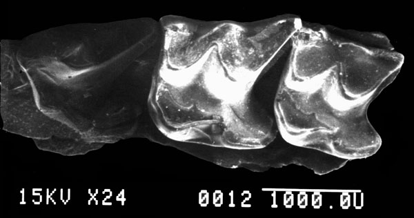 FIGURE 33. Cryptotis n. sp. (UCMP 317826): occlusal view of upper tooth row with P4 - M2 from left to right. SEM image. Scale equals is 1 mm.