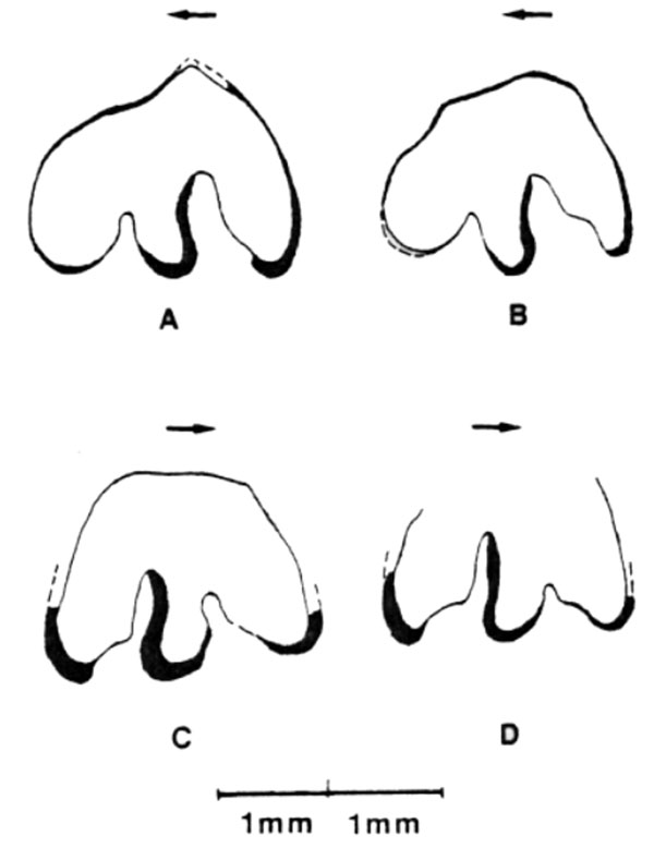 FIGURE 36. Hypolagus edensis, P3 occlusal patterns, A (UCMP 320607), B (UCMP 320604), C (UCMP 320606), D (UCMP 320605), arrows point toward anterior.