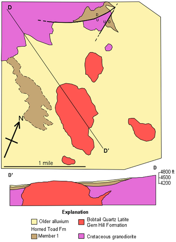 FIGURE 4. Geologic map and cross section in the western Horned Toad Hills illustrating relationship of Member One of the Horned Toad Formation with basement rocks of the Miocene Bobtail Quartz Latite and the Cretaceous Cameron granodiorite.