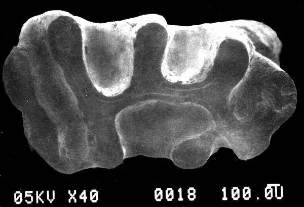FIGURE 40. Prothomomys warrenensis n. gen. n. sp. A: occlusal view of holotype P4 (UCMP 320186), B: lateral view of same P4 (UCMP 320186), C: Lateral view of paratype M1 (UCMP 320188), D: occlusal view of same M1 (UCMP 320188). SEM image. Scale equals 0.1 mm.
