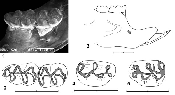 FIGURE 43. 1. Peromyscus sp. A (UCMP 320570), occlusal view of M1-M2 in right dentary fragment. SEM image. Scale equals 1 mm. 2. Peromyscus sp. A (UCMP 320570), occlusal view of M1-M2. SEM image. Scale equals 2 mm. 3. Peromyscus sp. A (UCMP 320570), labial view of right dentary. SEM image. Scale equals 2 mm. 4. Peromyscus sp. A (UCMP 320574), occlusal view of M1. SEM image. Scale equals 2 mm. 5. Peromyscus sp. B (UCMP 320572), occlusal view of M1. SEM image. Scale equals 2 mm.