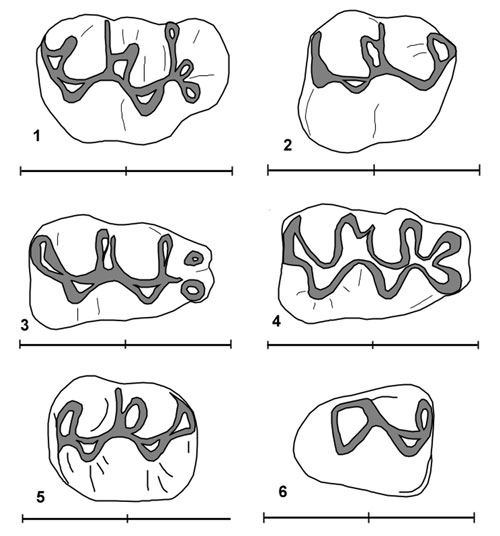 FIGURE 46. 1. Jacobsomys dailyi n. sp. (UCMP 320584), occlusal view of M1. SEM image. Scale equals 2 mm. 2. Jacobsomys dailyi n. sp. (UCMP 320585), occlusal view of M2. SEM image. Scale equals 2 mm. 3. Jacobsomys dailyi n. sp. (UCMP 320578), occlusal view of M1. SEM image. Scale equals 2 mm. 4. Jacobsomys dailyi n. sp. (UCMP 320583), occlusal view of M1. SEM image. Scale equals 2 mm. 5. Jacobsomys dailyi n. sp. (UCMP 320588), occlusal view of M2. SEM image. Scale equals 2 mm. 6. Jacobsomys dailyi n. sp. (UCMP 320589), occlusal view of M3. SEM image. Scale equals 2 mm.