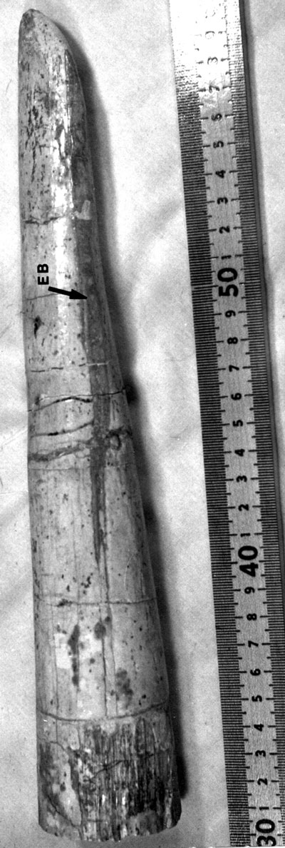 FIGURE 52. Rhynchotherium cf. R. edensis (UCMP 313449), lateral view of lower tusk (distal portion) showing small enamel band (EB). Meter stick for scale.