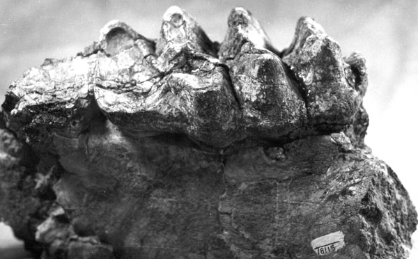 FIGURE 55. Pliomastodon vexillarius (UCMP 318115), oblique view of partial left dentary with M3. Note the smaller and more compressed posterior heel (at right) in this specimen as compared to that in Figure 54. Specimen approximately same size as UCMP 318112.