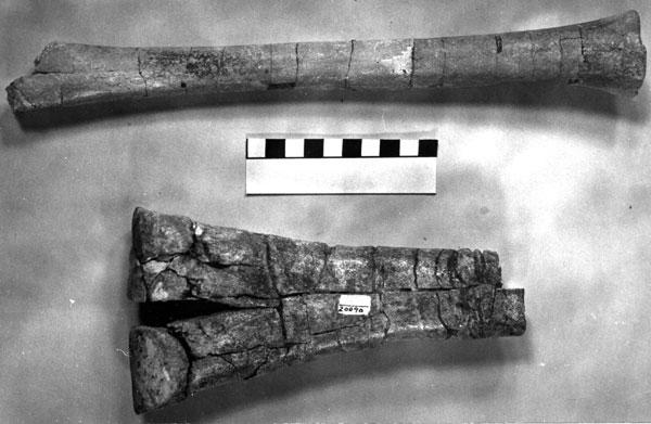 FIGURE 58. Above: (UCMP 320611) Hemiauchenia vera metapodial lacking the distal condyles. Below: (UCMP 320090) Megatylopus cf. M. matthewi, fragmentary distal metapodial. Scale in cm.