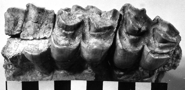 FIGURE 59. (UCMP 320094) Megatylopus cf. M. matthewi, occlusal view of maxillary fragment with M1-3 (left to right in photo). Scale in cm.