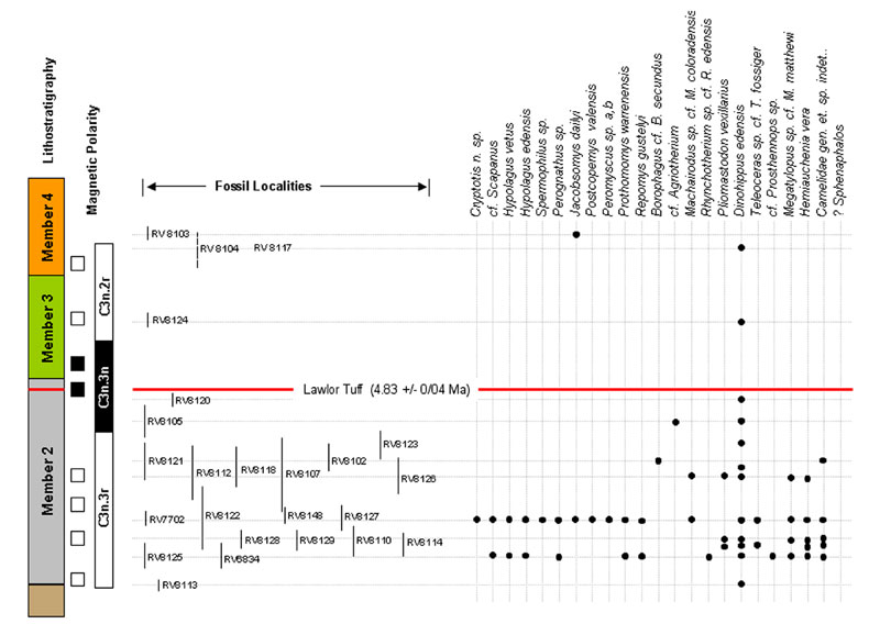 FIGURE 62. Summary of the lithostratigraphy, magnetostratigraphy, and biostratigraphy of the Horned Toad Formation. Open squares represent reverse polarity, closed squares represent normal. Vertical bars next to locality labels represent stratigraphic range associated with each locality.