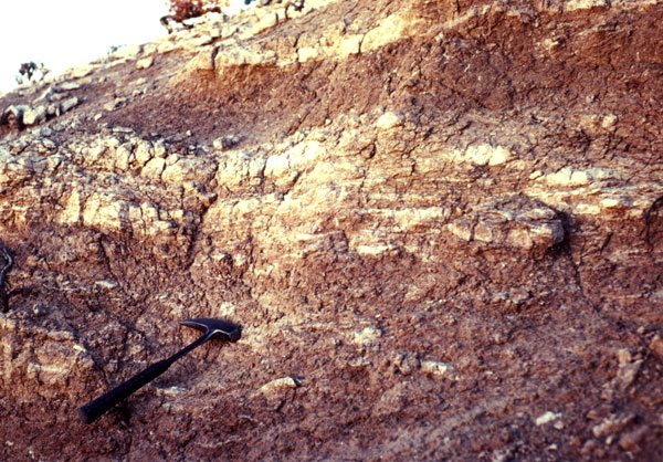 FIGURE 9. A locally gradational contact between Members One and Two is evidenced by thin beds of white, calcareous siltstone characteristic of Member Two, interbedded with brown sandy siltstone at the top of Member One. Rock hammer for scale.