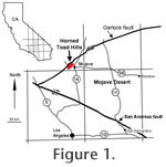 The Horned Toad Hills are located in the northwestern edge of the Mojave Desert geologic province (Figure 1). The Garlock fault, which forms the northern boundary of this province, lies just north of the Horned Toad Hills and is interpreted as a transform structure that separates a domain of large-scale late Cenozoic extension on the north from more limited Cenozoic extension to the south in the Mojave Desert (Davis and Burchfiel 1973;