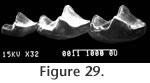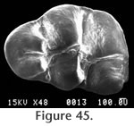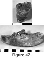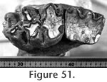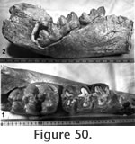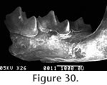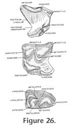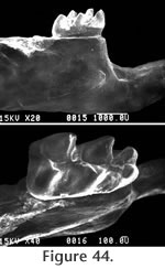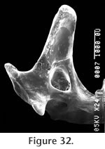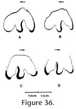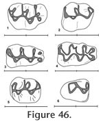 The talonids of M1 and M2 are not shortened anteroposteriorly. The mental foramen is located midway between the protoconid and the hypoconid of M1. The coronoid process is not deflected labially or lingually, and there is no coronoid spicule. There is no post-mandibular canal. The interarticular area of the mandibular condyle is narrow (Figure 31). P3 is present but much reduced. P4, M1, and M2 possess deep posterior emaginations.