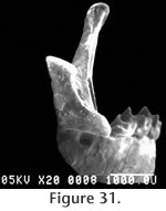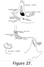 The superior and inferior articular surfaces of the mandibular condyle are separated by a relatively long and narrow interarticular area with a lingual emargination (Figure 31). The inferior articular surface is placed anterior and slightly lingual to the superior surface and is posterior to the inferior sigmoid notch (Figure 32). The inferior articular surface is roughly rectangular in shape while the superior surface is more approximately triangular. The entire condyloid process is deflected lingually.