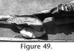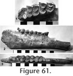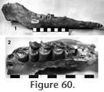 Description and Discussion: A medium size, lamine camel in the Warren Local Fauna is identified as Hemiauchenia vera Matthew. The best specimen, UCMP 320612 (Figure 60), includes associated left and right mandibles and the left maxillary of an advanced juvenile with P3 just erupting, C1 in the process of being replaced, and three alveoli of dP4 still present. The right mandible is nearly complete except for fragmentary dentition. The anterior portion of the left mandible is missing. UCMP 29794 is a fragmentary right mandible with P4-M2 of a mature adult. The lower dental formula of this taxon is I1-3, C1, P1, 3, 4, and M1-3. The lower molars are relatively low crowned, reflected in the shallow depth of the mandible.