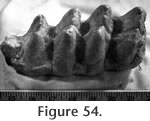 Description and Discussion: A third camelid of uncertain identity is present in the Warren Local Fauna. UCMP 320110 (Figure 61) is a nearly complete right mandible extending from the posterior edge of the symphysis to the base of the ascending ramus with P4-M3 and no alveoli for P2 or P3. The diastemal crest is not as sharp as in Hemiauchenia vera. The absence of P3 is an advanced character observed in Camelops, Lama, and Camelus although Webb (1974) notes that the presence of P3 is variable in Pleistocene Hemiauchenia. The teeth are well worn, and no fossetid is observable on P4. This tooth differs from that of the larger Hemiauchenia vera by being less angular with a weaker anterolingual groove. The M1 is worn nearly to the base of the enamel and is of little diagnostic value. Anterior stylids are absent on all lower molars of these specimens except for UCMP 320115, a lower M3 with a weak anterolingual stylid that is referred to this taxon on the basis of size. The upper molars are undiagnostic except for their relatively low height of crown (Figure 61.1).