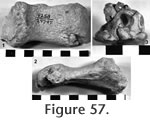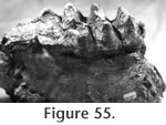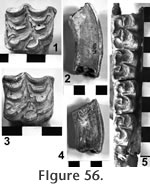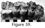Description and Discussion: A very large camel is present in the Warren Local Fauna but is represented by limited material. UCMP 320094 (maxillary with M1-3, Figure 59) represents an old individual with M1 completely worn and M3 moderately worn. The parastyle and mesostyle of M3 are well developed as is a strong anterolabial rib.
