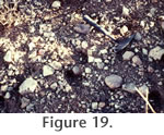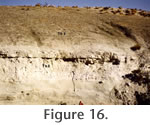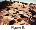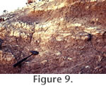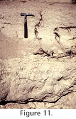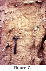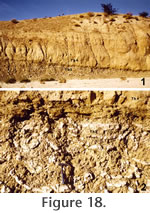 Figure 18 shows an outcrop in which the contact between Members Three and Four is well exposed. At this locality, the base of Member Four is a lenticular channel deposit of fine to very coarse sand approximately 2-3 m thick with internal trough cross bedding and normal graded bedding. The base of this channelform sandstone is a sharp contact with underlying greenish-brown clays of Member Three. These clays exhibit soft sediment deformation features including contorted laminations and convex-up dish structures (Figure 18.2). These features probably were produced by the rapid loading of heavy channel sands on the water-saturated clays. At the margins of the channelform sandstone, the clays of Member Three interfinger with the sand on a very small scale. These relationships document the depositional conformity of Member Four on Member Three and their relative proximity in age.