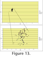 Similarity coefficients are also high when samples HTH-1, 4, and 5 are compared to the average of 43 analyses of well documented samples of the Lawlor Tuff collected from other locations in California, Nevada, and Arizona (Figure 14). Similarity coefficients are well within the range determined for replicate analysis of samples obtained from a single tephra layer. We note that values for sodium and potassium are scattered, an observation that applies to other tephra layers we have analyzed, particularly for older tephra layers, where different parts of the same layer were deposited under different depositional environments, or buried and stored under different climatic or geochemical conditions. For sample, in HTH-5, the iron values are somewhat lower than for most samples of the Lawlor Tuff, and we suspect that some leaching of iron from the glass, as well as hydration and alkali mobility, may have occurred.