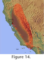 Figure 24.5, indicates that the Horned Toad Hills region has been rotated clockwise about a vertical axis by approximately 48°. Although the data for reversed polarity sites is highly scattered (k = 8.3, alpha95 = 19°), the mean for these sites (Dec = 203.6°, Inc = -56.5°;