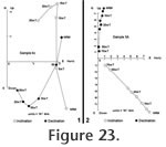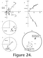 Although magnetic polarity was determined for all sampled localities, only three of the six sites (three, four, and five) yielded data from which site mean directions could be calculated (Table 2). The processing was accomplished by averaging a sequential series of thermal demagnetization steps using principal components analysis (Kirschvink 1980), or by selecting a single temperature step considered representative of the mean direction of that sample. Analysis of samples collected at sites one, two, and six, failed to result in a stable linear vector decay toward the origin of the orthogonal vector diagrams on which the demagnetization data were plotted (Figure 24.1). However, polarity determinations for these sites were nonetheless unambiguous, based on the position and trend of the horizontal and vertical components as seen in equal area stereo plots of the data (Figure 24.2,