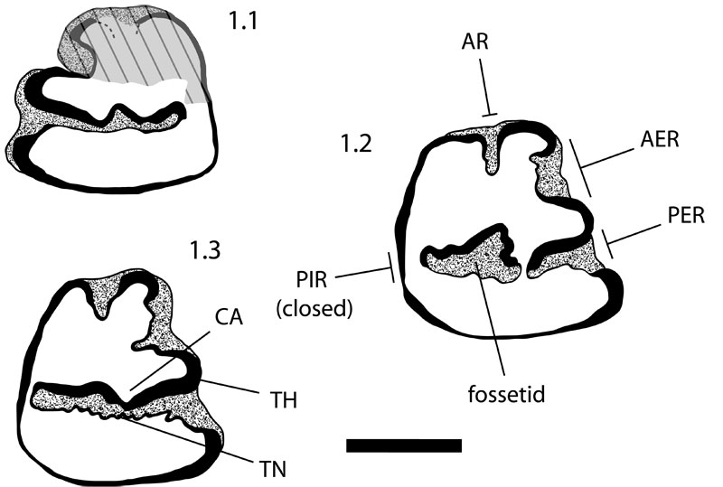 FIGURE 1. Occlusal view of lower third premolar of indeterminate leporine lagomorphs from Anza-Borrego Desert State Park. The top of the figure is anterior. 1.1, ABDSP (IVCM) 113/V413, left p3; 1.2, ABDSP(IVCM) 113/V1275, right p3; 1.3, ABDSP(LACM) 1906/V24889, right p3. Gray lined area is broken and at a lower level than the rest of the illustrated surface. Dashed lines indicate indeterminate trace of enamel. AR = anterior reentrant, AER = anterior external reentrant, CA = central angle, Fossetid = cement filled enamel lake, PER = posterior external reentrant, PIR = posterior internal reentrant, TH = thick enamel, TN = thin enamel. Scale equals 2 mm.