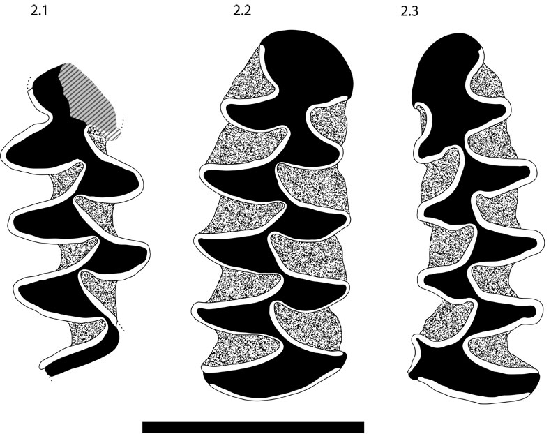 FIGURE 2. Occlusal view of lower first molar of arvicoline rodents from Anza-Borrego Desert State Park. The top of the figure is anterior. 2.1, ABDSP(LACM 1942/V8252, right m1, Lasiopodomys morphotype; 2.2, ABDSP(LACM) locality indeterminate/V24540, right m1, Microtus sp. with 5 closed triangles; 2.3, ABDSP(LACM) 68123/V24828, left m1, Microtus (=Terricola) meadensis. Gray lined area is broken and at a lower level than the rest of the illustrated surface. Dashed lines indicate indeterminate trace of enamel. Scale equals 2 mm.