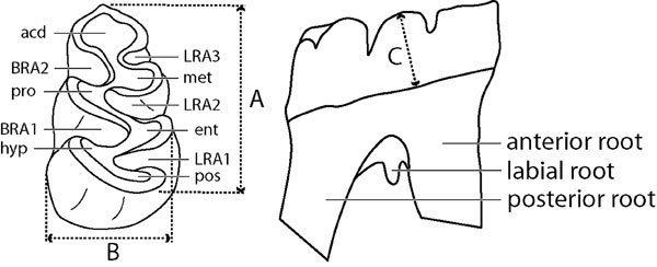 FIGURE 2. Dental terminology and methodology for measuring Sigmodon m1. Length (A) and width (B) were measured on the occlusal surface. The enamel height (C) was measured on the lingual side of the tooth from the tip of the metaconid to the lower extent of the enamel, perpendicular to the straight portion of the linea sinuousa below the anteroconid, metaconid, and entoconid. Abbreviations: acd, anteroconid; BRA 1 and BRA2, first and second buccal reentrant angles; LRA1, LRA2, and LRA3, first, second, and third lingual reentrant angles; ent, entoconid; hyp, hypoconid; met, metaconid; pos, posterolophid; pro, protoconid (following Martin and Prince 1979).
