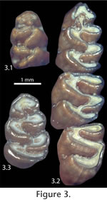 Variation in the occlusal pattern of the lower dentition of Sigmodon curtisi was examined and a sequence of change noted (Table 1). One specimen (UF 196273) shows little wear on the occlusal surface, and no roots had yet developed on this isolated right m1 (Figure 3.1). Isolated fields of dentine are exposed in the anteroconid and the major folds. Specimens with slight wear, but not yet exhibiting the mature wear pattern, are here called juveniles. However, the correlation between dental pattern and sexual maturity is unknown in S. curtisi, so the terms juvenile and mature are used here only for convenience. The mature pattern is considered present once dentine is visible in the connections between the anteroconid, metaconid, protoconid, entoconid, hypoconid, and posterolophid, and the anteroconid is symmetrical.