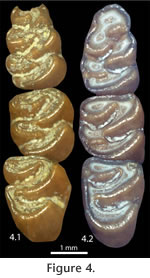 Qualitative variation in the occlusal pattern through ontogeny is the same for the populations from both Inglis 1A and Inglis 1C, with the exceptions specified below. Few individuals in either population exhibit a juvenile pattern, possibly due, at least in part, to the brachydont nature of the teeth that show change in occlusal morphology with relatively little wear and destruction during predation. The symmetrical shape of the anteroconid is the last feature on the m1 to attain the mature wear pattern. After the mature pattern of the m1 is reached, both the associated m2 and m3 develop an enamel pit from the constriction of the second buccal reentrant angle (BRA2; protoflexid of