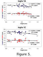 Plotting the length and width of the m1 against the height of the tooth shows how little these dimensions change with increasing wear (= age) in either sample of Sigmodon curtisi (Figure 5). The stronger correlation between height and length occurs in the Inglis 1C sample; however, the amount of variation it explains (0.27 mm) is only 12% of the average length (2.31 mm). There is even less correlation between crown height and occlusal width.
