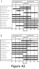 Albright et al. 2008). ?Miohippus equinanus does not extend to the Ar 2 in Oregon, but is known to persist through the Oligocene of the Great Plains (MacFadden 1998). Cormocyon copei, Parenhydrocyon josephi and Mesoreodon sp. first occur in the Ar 1 of Oregon and continue into the Ar 2 (Wang 1994;