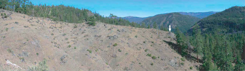 FIGURE 13. Unit B, upper Wildcat Creek beds, exposed along the western unnamed tributary. Arrow indicates location of prominent coarse tuff at base of fossil bearing strata.