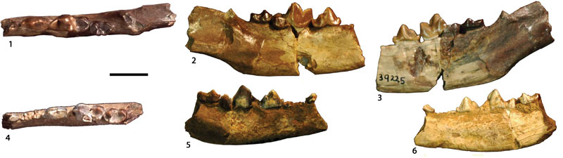 FIGURE 20. Partial right dentary with p4-m2 (UWBM 39225)of Cormocyon copei in occlusal (1), buccal (2), and lingual (3) views. Partial right dentary with p2, p4-m2 (UWBM 40738) of Cormocyon copei in occlusal (4), buccal (5), and lingual (6) views. Scale bar equals 1 cm.