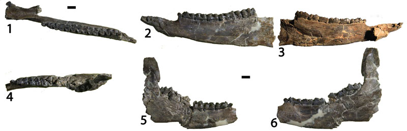 FIGURE 27. Partial mandible (JODA TS07055) of Miohippus. Left dentary with p1-m3 and right i2 shown in (1) occlusal, (2) buccal, and (3) lingual views. Right dentary with p1-m3 shown in (4) occlusal, (5) buccal, and (6) lingual views. Scale bar equals 1 cm.