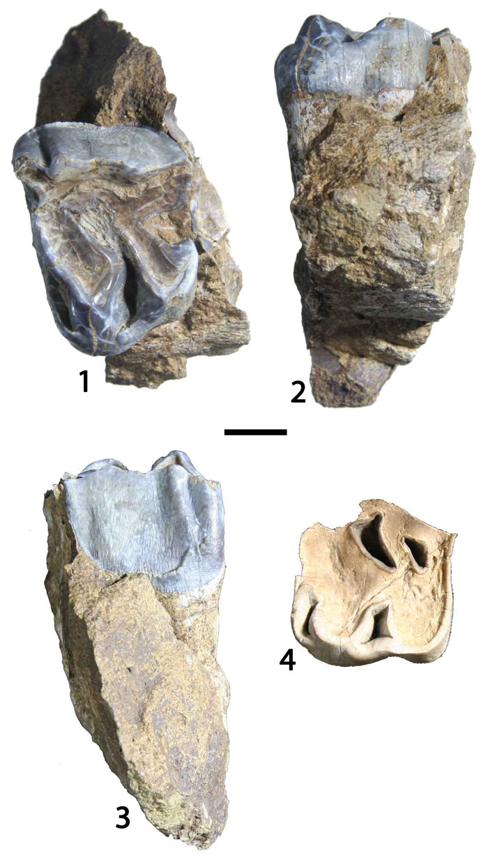 FIGURE 28. Left upper cheek tooth (JODA 8949) (1-3) and partial left upper premolar (UCMP 65229) (4), of Diceratherium annectens. Shown in occlusal (1, 4), lingual (2), and buccal (3) views. Scale bar equals 1 cm.