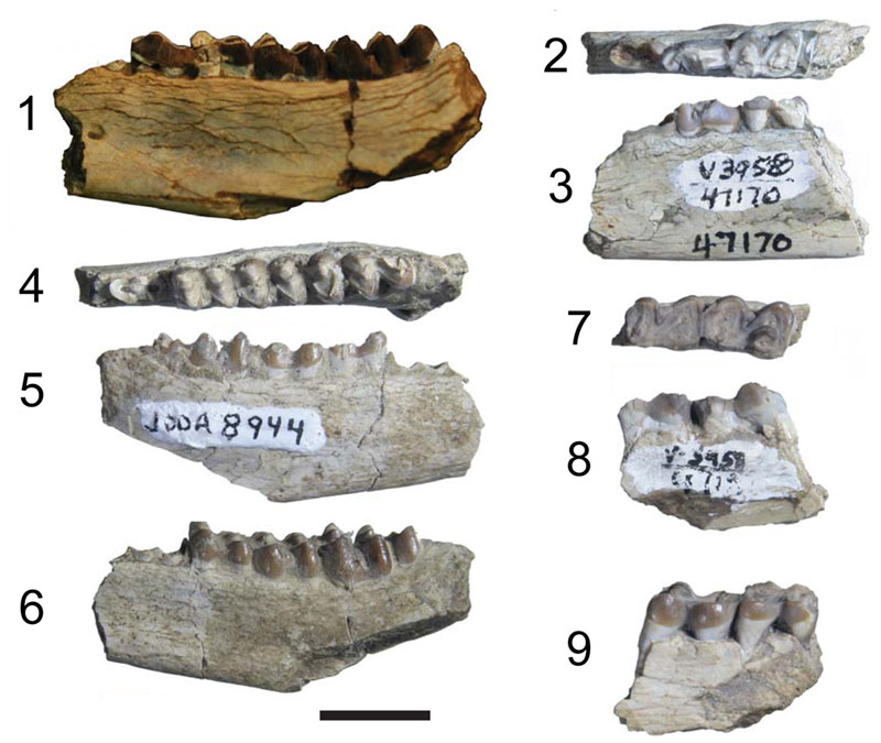 FIGURE 32. Partial left dentary with p4-m3 (UWBM 29151) (1), partial right dentary with p4 and m1 (UCMP 47170) (2, 3), partial left dentary with m1-m3 (JODA 8944) (4-6), and partial right dentary with m1 and m2 (UCMP 47165) (7-9) of Hypertragulus. Specimens shown in occlusal (2, 4, 7), buccal (3, 5, 8), lingual (1, 6, 9) views. Scale bar equals 1 cm.