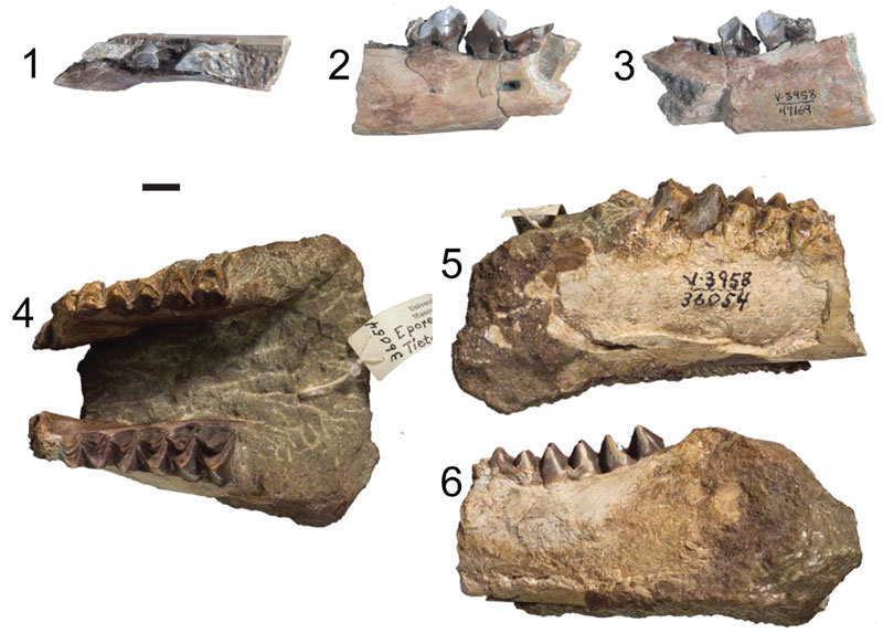 FIGURE 33. Partial left dentary with p3 and partial p4 (UCMP 47169) (1-3), and partial right and left dentaries (UCMP 36054) (4-6) of Eporeodon. Specimens shown in occlusal (1, 4), buccal (2, 5, 6), and lingual (3) views. Scale bar equals 1 cm.