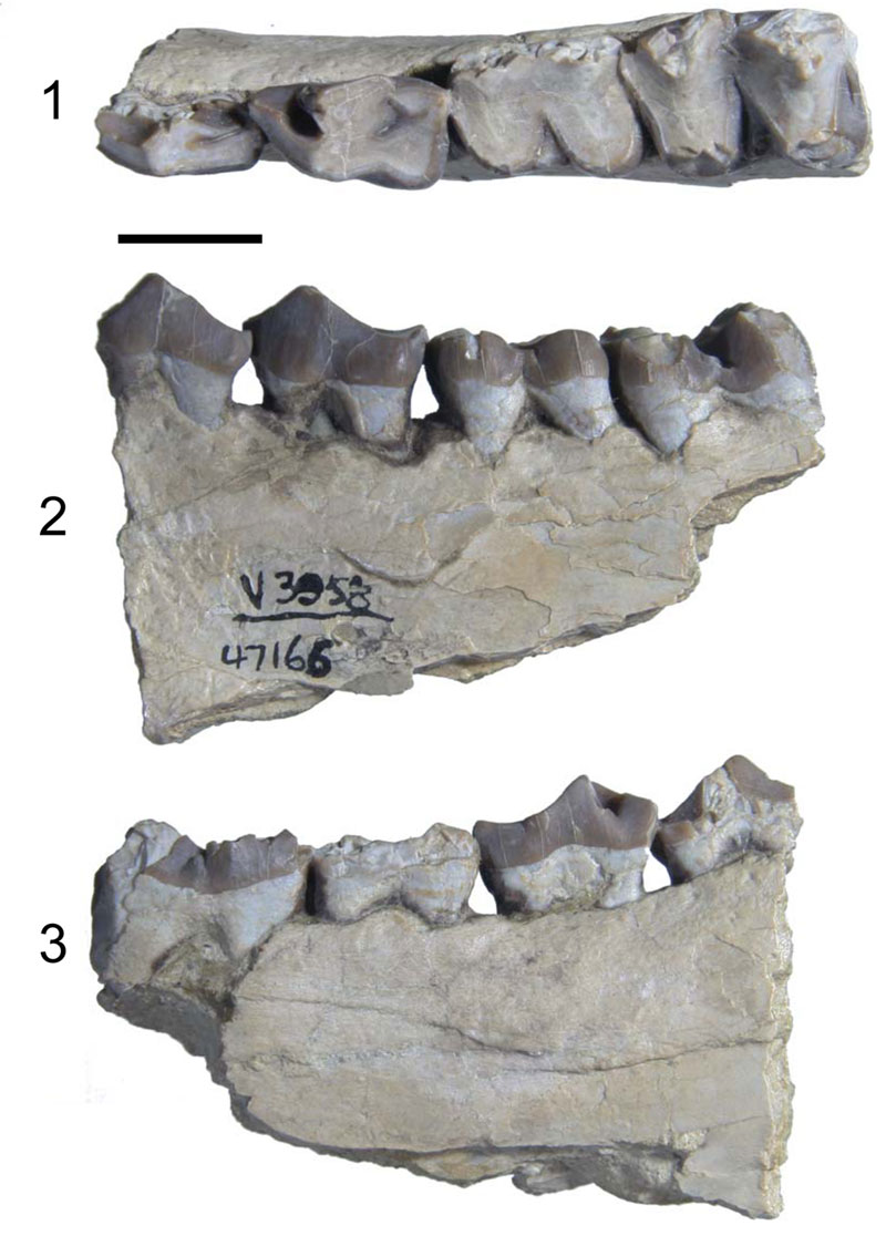 FIGURE 34. Partial left dentary with p3 to m2 (UCMP 47166) of Merycoides sp. Specimen is shown in occlusal (1), buccal (2), and lingual (3) views. Scale bar equals 1 cm.