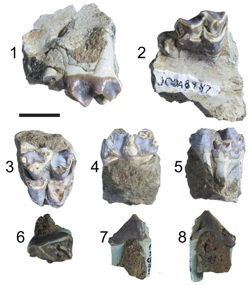 FIGURE 35. Partial left maxilla with P3 (1,2), upper left molar (3-5), and lower right p3 (6-8) (JODA 8947) of Mesoreodon sp. Specimens shown in occlusal (2, 3, 6), buccal (1, 4, 7), and lingual (5, 8) views. Scale bar equals 1 cm.