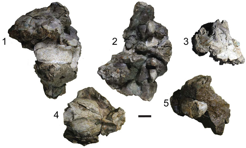 FIGURE 37. Partial crania (UCMP 128070) (1-3) (UCMP 128071) (4, 5) of Promerycochoerus superbus. Specimens shown in dorsal (1, 4), ventral (2), lateral (3), and posterior (5) views. Scale bar equals 3 cm.