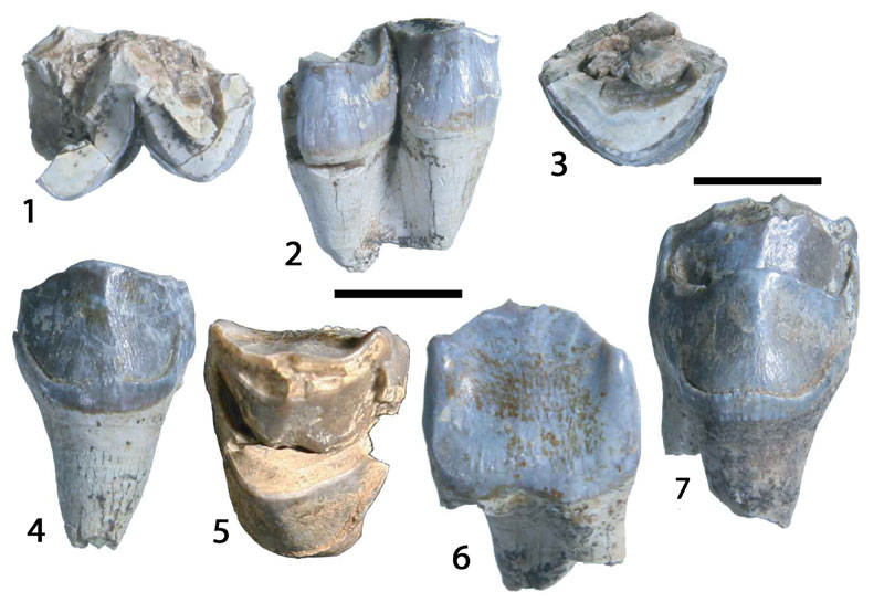 FIGURE 39. Partial upper or lower cheek tooth (1, 2), partial left P4 (3, 4), and partial right P4 (5-7), (JODA JS07051) of Promerycochoerus superbus. Specimen shown in occlusal (1, 3, 5), buccal (6), and lingual (2, 4, 7) views. Scale bar equals 1 cm.