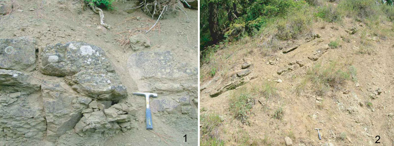 FIGURE 6. Bedding characteristics in outcrop view. Undulatory contacts (1) and discontinuous bedding (2) are common in the upper Wildcat Creek beds.