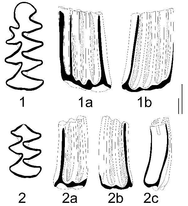 FIGURE 1. Mimomys hordijki, holotype, (LMB no. Z3-201). 1. m1, occlusial view; 2. m2, occlusial view; a: labial view; b: lingual view; c: posterior view. Scale bars equal 1 mm: the longer bar stands for occlusal view, the shorter one is for lateral view.