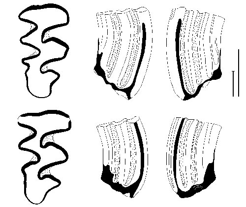FIGURE 3. Mimomys hordijki, upper M3. 1. Z9-2, right M3, occlusal view; 2. Z6-2, right M3, occlusal view; a: lingual side; b: labial side. Scale bars equal 1 mm: the longer bar stands for occlusal view, the shorter one is for lateral view.