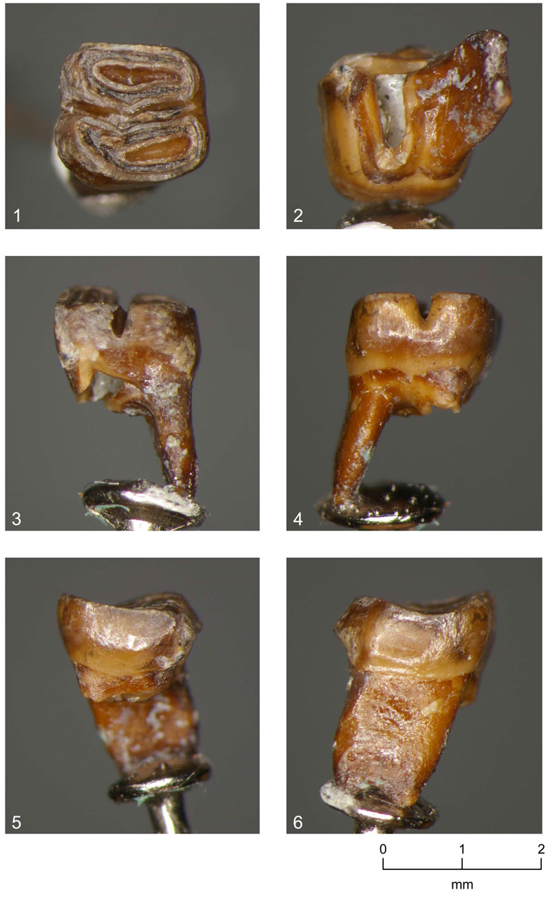FIGURE 1. Photographs of the holotype (NMNS-PV 20153; left m1) of Megapeomys repenningi. 1 occlusal, 2 latero-basal, 3 buccal, 4 lingual, 5 mesial, and 6 distal views.